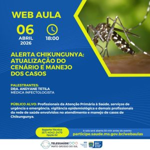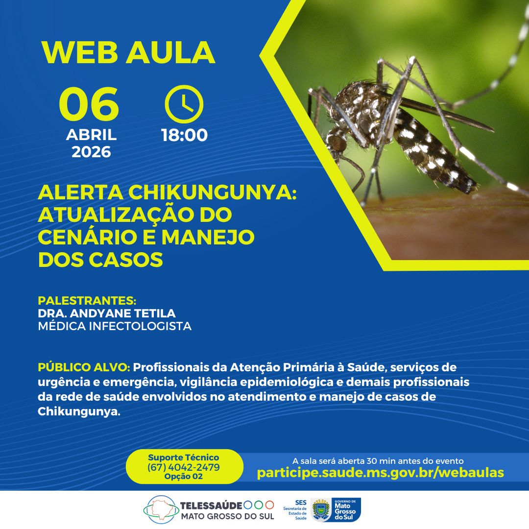 A web aula poderá ser acessada pelo link: participe.saude.ms.gov.br/webaulas e é direcionada a profissionais da Atenção Primária à Saúde, serviços de urgência e emergência, vigilância epidemiológica e demais trabalhadores da rede envolvidos no atendimento e manejo dos casos.